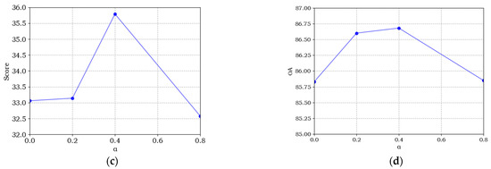 Sensitive analysis of α for the multi-task loss. (a–d) denote the accuracy curve of mIoU, Sek, Score, and OA, respectively.