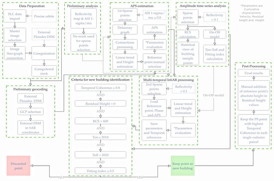Multi-temporal PSI analysis was applied to pixels showing reflectivity values higher than 0.1, assuming that almost all points in the study area will be included as PSC in parameters calculation. The selection of this low value derives from the assumption that some PSC points may present low reflectivity and ASI 1-sigma/mu values due to their birth date that differs from the beginning of the data time series. In a nutshell, selecting PSC points based on a standard method, such as a moderate dispersion index value, may cause the loss of pixels which are candidates to classify as new buildings. In conjunction with the on-off model as weight in the multi-temporal analysis, as stated below, the temporal coherence will be the factor to clarify which of them constitute PS points. The proposed method emphasizes the key role of the residual height parameter in combination with some other metrics, since the assumption is made that objects higher than the reference point are buildings. The parameters in specific are the Ton/Toff values derived by the amplitude time series analysis and the fitting index, the temporal coherence, the residual height, and the radar cross section (RCS).