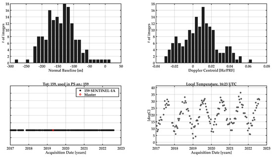 Dataset of the Descending Orbit. The upper left graph illustrates the normal baseline distribution of image pairs. The upper right graph illustrates the Doppler centroid distribution of image pairs. The lower left graph illustrates the temporal baseline. The lower right graph illustrates the local temperature per acquisition date.