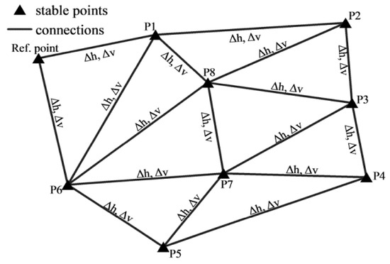 Repeat-pass SAR interferometry suffers from atmospheric variations that affect the transmitted signal of the satellite and degrade the final measurements by contributing to the phase difference. To remove it, an atmospheric phase screen procedure is based on the general rule that the atmosphere changes rapidly in time but not in space. For example, the atmospheric effect between two adjacent points (e.g., that are a few hundred meters apart) is too small to impact the phase difference between them. Applying this rule in a larger study area, a triangulation network must be set between stable points aiming to measure the height (Δh) and velocity (Δv) differences between connections, as represented in Figure 7.