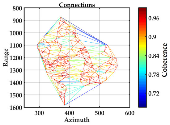 Triangulation network between the selected PSC points. The color lines represent the coherence of each connection between two close PSC points. Connections presenting coherence equal to or higher than 0.7 were used (example of descending VV data).