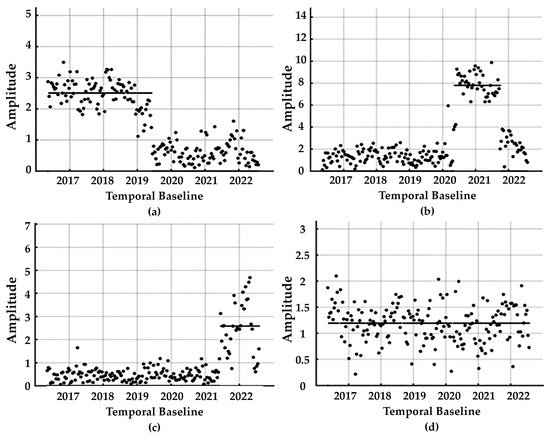 The on–off model accompanied by the fitting index adapted in SARPROZ software (8 September 2022 version) was used for the amplitude time series analysis and the Ton (birth) and Toff (death) dates estimation. Abrupt changes in amplitude values with respect to time are detected based on a Bayesian change-point step detector algorithm [32]. The model analyses the amplitude as a function of normal baseline, Doppler centroid, temporal baseline, and temperature, which constitute the characteristics (Θamp) of a hypothetical target k [33,34]. The fitting index (ξamp) (3) represents the degree of agreement between the model and the data measuring on a scale from 0 to 1, and can consider as an amplitude stability advance measure [28].