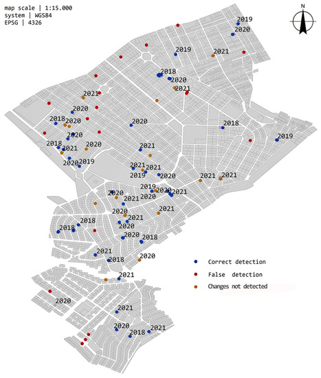 The primary goal was to detect new buildings. The results show that most, but not all, new buildings are detected by the proposed method. The method is not able to detect some new buildings. The omission errors are due to a residual height value that does not pass the set threshold. This can happen because the scattering center of the target, which is generally unknown, can be low in the building facade. In some other cases, a low-rise building pre-existed and a few stories were added on top of it. As a result, abrupt changes in the reflectivity value do not appear. In other instances, due to the satellite resolution and the object’s orientation, the method cannot distinguish between two adjoining attached buildings. This finding indicates that the method’s efficiency is reduced by using moderate resolution Sentinel-1 data, for areas that present an attached planning system, and the objective is per-building detection. The commission errors, the incorrectly detected points as new buildings, are mainly due to mistaken reflectivity changes. It is known that SAR images before co-registration are not perfectly aligned and present pixel offsets. The combination of the moderate resolution imagery used and the different speckle noise of each image probably generates this false alarm for abrupt changes in the reflectivity in some situations.