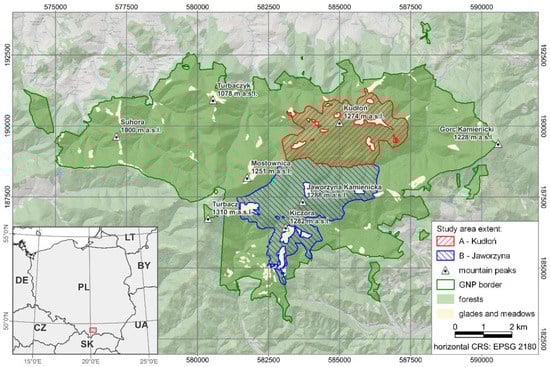The location of the study area in Gorce National Park. Subarea A (the Kudłoń range) in the northern part and subarea B (the Jaworzyna Kamienicka range) in the southern part.