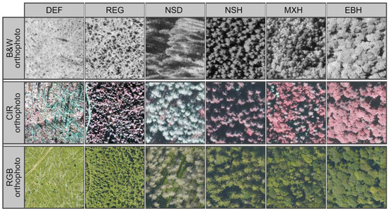 A photointerpretation key developed for defined LC classes for three types of color composite orthophoto imagery used in the study. LC class abbreviations: DEF: deforested areas with fallen deadwood, forest gaps; REG: young forests on post-decline areas; NSD: standing, dead and severely damaged groups of Norway spruce trees; NSH: mature, healthy forest stands dominated by the Norway spruce; MXH mature, healthy mixed forest stands; EBH: healthy, forest stands dominated by the European beech.