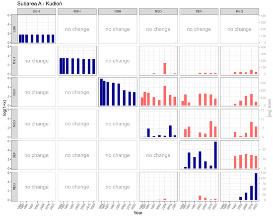 LC classes conversion matrix in subarea A (the Kudłoń range) for analyzed time periods. Data represented with red bars was logarithmically transformed (left y axis), changes represented with blue bars are shown in hectares (right y axis).