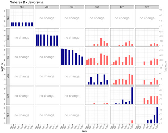 LC classes conversion matrix in subarea B (the Jaworzyna range) for analyzed time periods. Data represented with red bars was logarithmically transformed (left y axis), changes represented with blue bars are shown in hectares (right y axis).