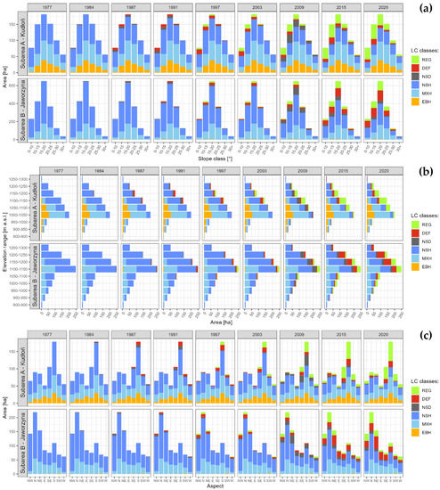 LC classes area in defined (a) slope classes (b) elevation zones (c) slope aspect classes in subarea A (the Kudłoń range) and subarea B (the Jaworzyna range). LC class abbreviations: REG: young forests on post-decline areas; DEF: deforested areas with fallen deadwood, forest gaps; NSD: standing, dead and severely damaged groups of Norway spruce trees; NSH: mature, healthy forest stands dominated by the Norway spruce; MXH mature, healthy mixed forest stands.