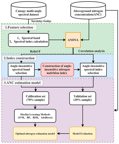 Nitrogen is the most important mineral nutrient element for crops, and it is also a key factor for crop growth and yield formation. Timely and accurate estimation of crop canopy nitrogen content is the key to the scientific and efficient use of nitrogen [1]. Compared with the traditional method of destructive sampling to obtain crop nitrogen status, the use of remote sensing technology can non-destructively, accurately, and quickly obtain the spectral information of crops in a large area and provide decision support for the later formulation of scientific and reasonable fertilization programs. The use of spectral reflectance to accurately monitor crop canopy nitrogen content is based mainly on the response of the biophysical characteristics of crop leaves to spectral reflectance [2]. Crop canopy spectral reflectance is affected by crop plant type, canopy structure, solar zenith angle, observation angle, and canopy coverage [3]. At the same time, the optical remote sensing observation is affected by the bidirectional reflection of the canopy, and the observation from a single angle cannot rule out the interference of many factors [3]. This directly results in a large spatiotemporal variation in the spectral reflectance of the canopy and the physiological characteristics of plants and often causes the absorption characteristic bands of the nitrogen content of the canopy to shift [4]. The vegetation index established by using methods such as normalized difference can reduce the influence of canopy structure and angle to a certain extent; for example, the optimized soil-adjusted vegetation index (OSAVI) can alleviate the structural effect to a certain extent, but it has not yet solved Canopy spectral reflectance suffers from two-way (illumination and viewing geometry) effects [5].