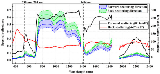 Cotton canopy spectral change characteristics under two-way observation angles (purple and green areas are one-quarter median and three-quarters median spectral reflectance ranges in two scattering directions (n = 2340)). Solid black and red lines are Kruskal–Wallis test statistics between different viewing angles for two scattering directions (n = 1170).
