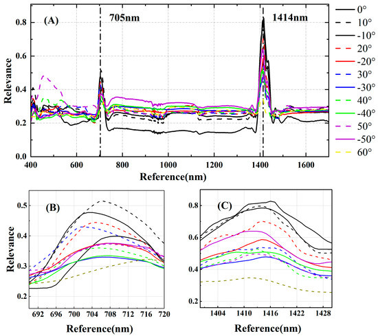 Based on the Relief-F algorithm, the single-wavelength weight value of ANC with cotton under different VZAs was evaluated. (A) Single-wavelength weight value with cotton ANC under different VZA, (B) Weight value of ANC near 705 nm and cotton under different VZA, (C) Weight value of ANC near 1414 nm and cotton under different VZA.