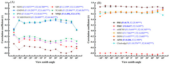 Correlation between spectral indices and ANC under different VZAs. (A) VZA sensitivity index, (B) VZA insensitivity index. In the brackets of the legend, F1 is the F value of variance analysis in the backscattering direction (−60° to 0°), F2 is the F value in the forward scattering direction (0° to 60°), * p < 0.05; ** p < 0.01; *** p < 0.001.