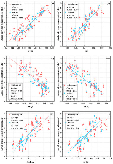 In this study, the indices AINI, PRI, and PRIC were strongly correlated with nitrogen accumulation, and the correlation coefficient reached an average of more than 0.8. The bands constituting the above spectral indices were distributed in the green band and the red edge area, which is because the green band is more sensitive to plant nitrogen status. Previous studies have shown that the degree of blue shift at the red edge of vegetation is significantly related to the physiological characteristics of the vegetation canopy [50]. Red edge (700–760 nm) is a transition region with rapid changes in leaf reflectivity caused by strong pigment absorption in the red spectrum and leaf scattering in the near-infrared spectrum, and it has been found that the red edge is sensitive to crop canopy nitrogen [23]. The previous research illustrated the reliability of spectral information in the red-edged region, and the results of this study confirm that view. The better indices (AINI, PRI, PRIC, MTCI, and mSR705) include the wavelength of green light or the red−edge region.