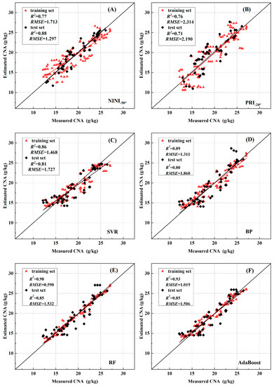 Comparison of predicted and measured values of nitrogen accumulation in cotton canopy based on AINI−50°, PRI−20°, and their combinations (n = 180, training set = 126, validation set = 54): (A) −50° AINI, (B) −20° PRI, (C) SVR Modeling of two spectral indices combination, (D) BP Modeling of two spectral indices combination, (E) RF Modeling of two spectral indices combination, (F) AdaBoost Modeling of two spectral indices combination.