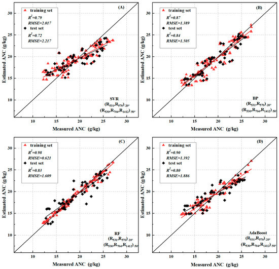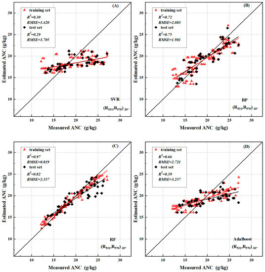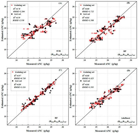 It can be seen from Table 3 that after correlation analysis, the indices PRI and AINI are significantly correlated with ANC, and the correlation between each VZA reaches more than 0.8, so these two spectral indices were selected as the input variables for the construction of machine learning models. A total of 70% of the data volume was randomly selected as the training data set, and 30% was used as the test data set. The four models, support vector regression (SVR), BP neural network, random forest (RF), and AdaBoost, were used for training, and the Python programming language was used to implement the algorithm.