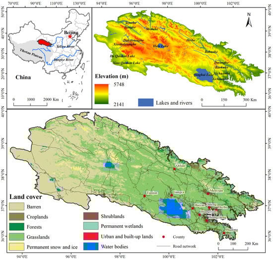 The QLM region (35.8–40°N and 93.3–103.9°E), a typical alpine area, is located on the northeastern edge of the Qinghai–Tibet Plateau, which is known as the “roof of the world”. The QLM area extends approximately 1000 km from the southeast to the northwest, covering around 184,000 km2 (Figure 1). Administratively, the QLM region belongs to Gansu and Qinghai provinces in northwest China. The overall terrain of the QLM is higher in the west and lower in the east. The elevation ranges from 2141 m to 5748 m, with an average value of 3500 m above sea level. This area has a typical plateau continental climate, with a mean annual temperature of −0.8 °C, and annual precipitation ranging from 150 mm to 800 mm, increasing from west to east [28]. Grassland covers the largest fraction of the QLM, accounting for 53.45% of the total area. Barren land occupies the second-largest area (40.15%) and mostly occurs in the western QLM [29]. The QLM region has complex topographic and climatic conditions, and the area’s natural ecosystem is fragile and sensitive to climate change and human activities [30]. In addition, many mining and waterpower resources are present in the region. Such resource exploitation causes regional vegetation damage, water quality degradation, and environmental pollution [31]. In this context, eco-environmental issues in the QLM have received widespread attention. To prevent degradation of the area’s eco-environment, the Qilian Mountain National Park was established in 2018. Therefore, we hope that this case study of spatiotemporal EEQ changes in the QLM will provide a reference for investigating and preserving other similarly fragile areas.