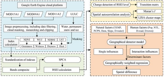 An overview workflow of this study is shown in Figure 3. The major steps are as follows: (1) calculate the four ecological indexes (greenness, wetness, dryness, and heat) using on the GEE platform, (2) construct the RSEI and analyze the spatiotemporal differences in the EEQ in the QLM in five periods, (3) detect intensity changes of different RSEI levels and identify the spatial autocorrelation characteristics of the RSEI, and (4) determine the impact of EEQ driving factors in the QLM.