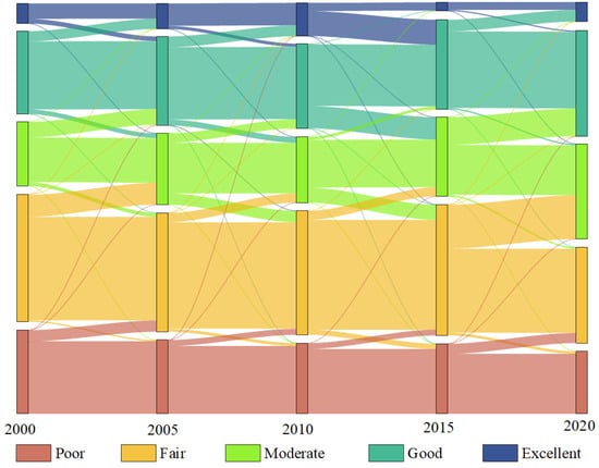 To observe EEQ changes at each ecological level, we use a transition matrix to express detailed EEQ change processes from 2000 to 2020. Throughout the studied period, the EEQ is mainly at poor, fair, moderate, or good levels (Figure 5). Specifically, from 2000 to 2010, the EEQ shows an upward trend: the area of poor and fair levels decreased, and the area of good and excellent levels increased, with EEQ level transitions mostly from poor, fair, moderate, and good to fair, moderate, good, and excellent, respectively. During 2010–2015, the EEQ begins to deteriorate. The area of excellent EEQ level decreases significantly, while increasing trends are recorded for the areas of good, moderate, and fair levels (Figure 5). The EEQ shows an improved trend from 2015 to 2020, with a decrease in the area of poor and fair levels, with most EEQ transitions recorded from fair, moderate, and good levels to moderate, good, and excellent, respectively (Figure 5).