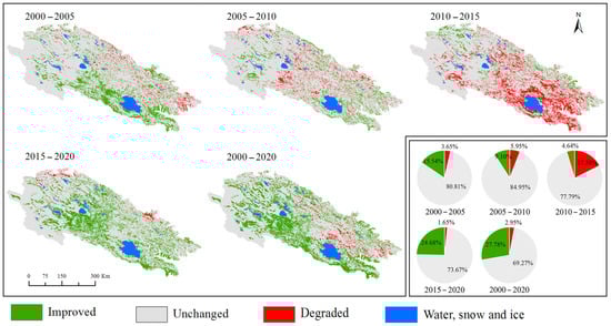 We use a spatial analysis method to study the EEQ spatiotemporal changes in different periods from 2000 to 2020 (Figure 6) based on the transition matrix in Table 2. During 2000–2015, the area of unchanged and improved EEQ decreased. However, the area of degraded EEQ increased, that was especially prominent in 2010–2015 when the area of improved EEQ was much less than that of degraded EEQ. After 2015, the area of unchanged EEQ continued to decrease. However, the area of improved EEQ is much greater than that of degraded EEQ, indicating that ecological deterioration in this period had largely been controlled. For example, during 2000–2005, the improved EEQ area was mainly concentrated around Qinghai Lake, while the area of degraded EEQ was distributed in the north of the area (Figure 6). However, from 2005 to 2015, the EEQ gradually degraded, with changes mainly concentrated in the southeastern QLM (Xichuanhe, Baokuhe, Datonghe, and Qinghai Lake watersheds). In contrast, in 2015–2020, the EEQ gradually improved; improved EEQ areas accounted for 24.68% of the total study area during this period, with improvements mainly concentrated around Hala Lake (Figure 6). In summary, from 2000 to 2020, the eco-environment of the QLM shows a trend of initial deterioration followed by improvement.