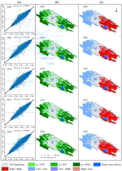 The Moran scatter plots (a), significance maps (b), and LISA clustering maps (c) of EEQ in the QLM from 2000 to 2020.