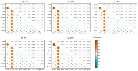 The results of interaction detection of influencing factor pairs on the EEQ of the QLM are illustrated in Figure 8. Overall, the explanatory powers (q-statistics values) of the interactions between factor pairs on EEQ are greater than those of any single factor. Specifically, the interaction between TEMP and PCPN is the greatest, with q-statistics values between 0.749 and 0.830 from 2000 to 2020 (Figure 8). The interactions between PCPN and other factors showed, q-statistics values between 0.644 and 0.785 with a bivariate enhancement interaction type, except for PCPN ∩ Dem. Furthermore, the q-statistics values of D-town and D-water with other driving factors range from 0.188 to 0.408. However, the interactions between NTL and other factors are the smallest (<0.087), except for NTL ∩ PCPN.