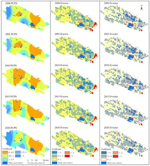 Based on the GeoDetector analysis results from 2000 to 2020, PCPN, D-town, and D-water are the three main factors influencing EEQ in the QLM (Table 5). Therefore, we use the GWR model to further explore the impact of these three factors on the spatial heterogeneity of EEQ in the QLM region. In the GWR model, regression coefficients are used to represent the spatial distributions of the impact intensity of the three factors on EEQ (Figure 9). The mean regression coefficients of PCPN in the five periods from 2000 to 2020 are 0.915, 0.769, 0.596, 0.709, and 1.138, suggesting that PCPN positively influences EEQ in the QLM. From the spatial distribution of regression coefficients, the influence of PCPN decreases from the northwest to the southeast, with the northwestern part of the study area and the western Qinghai Lake affected the most (Figure 9). The mean regression coefficients of D-town and D-water are small (−0.117–0.019) with both positive and negative values; thus, the impact of these two factors on EEQ is considered uncertain.