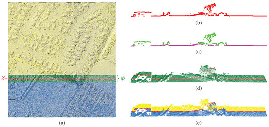 Illustration of Points-profile and Profile-stack: (a) Points-profile and Profile-stack in patch data (with DSM), where blue points denote areas that have been classified and yellow points denote areas that have not been classified, green points denote profile-stack and red points denote points-profile; (b) Points-profile; (c) Ground truth in points-profile; (d) Profile-stack; (e) Profile-stack containing both classified and unclassified areas.