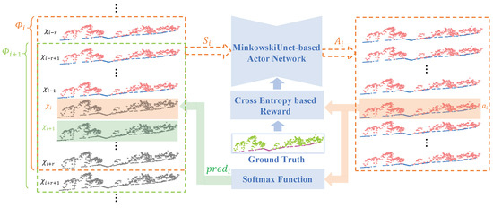 By maximizing the critic’s estimation of Q, the actor is optimized. Specifically, the actor would decide which points belong to the ground category in each points-profile and the critic gives a prediction on the reward. As mentioned in Section 2.2.2, the action at state provides the prediction result on . In the next step, we also have based on the formulation of the profile-stack. Thus, the action at time step contains which gives a segmentation probability of at time step . During the one-step look-ahead training process in RL, is obtained by