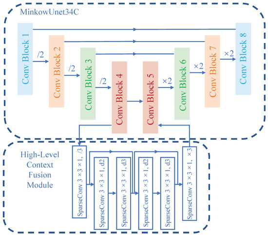 Notably, rather than using regular sparse convolution, which has the same tensor stride in all three axes, we only use the 3 × 3 × 1 convolution kernel in the HCF module, which based on the observation that the large-scale ALS point clouds usually requires a different degree of down-sampling on the z-axis and the x–y plane. At the bottom level of the network, the receptive field along the z-axis is already enough and further down-sampling is cumbersome in some way. These are the main differences from simply making the network deeper, we conduct an experiment and demonstrate that naively deepening the network may not produce satisfactory results. The network architecture is depicted in Figure 5.