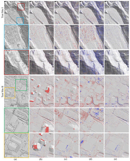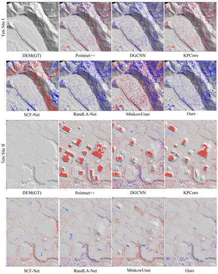 Some visualized results on large buildings in Test Site II of different network architectures. Points in red and blue denote the misclassified non-ground and ground points, respectively.