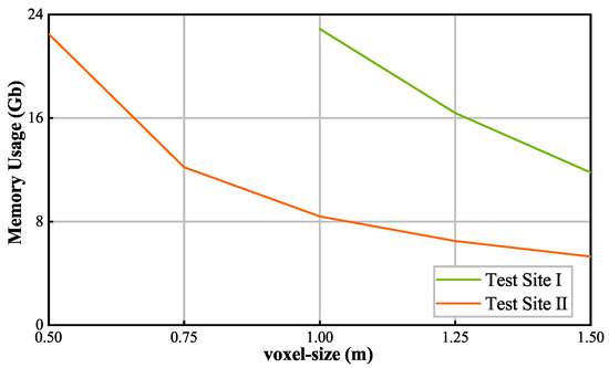 As shown in Figure 6, the network with the highest spatial resolution (0.5 m) produces a fine result on Test site I; however, the large building roof, which spans more than 300 m, has not been removed properly due to the lack of contextual information. As contextual information increases, the large building roofs are correctly identified, but the incorrect classification close to the ground surface increases at the same time. In theory, we could set the high spatial resolution and large contextual information simultaneously (e.g., 0.5 m voxel-size with 384 m contexts), but the memory footprint may rise unacceptably, as shown in Figure 7. We set batch size 1 for a single forward pass and gain more than 20 Gb maximum GPU memory consumption on Test Site II. On Test Site I, 24 Gb GPU memory is insufficient to complete the whole prediction procedure when set at a spatial resolution (voxel-size) of 0.5 m and 0.75 m with 384 m contextual information. Due to the intrinsic characteristics of the sparse convolutional neural networks, GPU memory usage fluctuates with data sparsity. Thus, we only consider the maximum value.