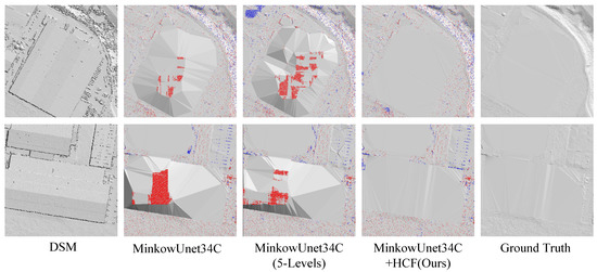 As shown in Figure 9, the proposed HCF module facilitates the removal of the large building roof significantly. The explanations are that, when dealing with a large-scale ALS point cloud, the points span at a larger range on the x–y plane, rather than on the z-axis, which means that the effective down-sampling ratio is different for the z-axis and x/y-axis. Especially at the bottom level of the network, the receptive field along the z-axis is sufficient. In this situation, down-sampling is redundant and is likely to result in misclassifications on flat terrains and large building roofs for the similarity of these two classes. Thus, the proposed HCF module, which only conducts the down-sampling operation on the x-axis and y-axis by a 3 × 3 × 1 convolution kernel with dilation, produces better results. Notably, the number of parameters in the model with the HCF module is 237 M, which is almost half of the five-level MinkowUnet34C (408 M).