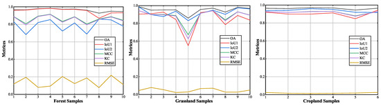 The per-sample evaluations are illustrated in Figure 11, in which we can observe more variance in each metric in the steep forested areas than in the other two classes. It demonstrates that the SeqGF is more robust in grasslands and croplands. Meanwhile, the performance in steep forested areas is relatively weak. However, please note that the highest RMSE among the ten forest samples is around 0.2, which indicates a fine performance according to the result of Table 2 and Table 3.