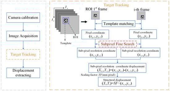 In order to improve the resolution of the displacement, the sub-pixel technology is combined with the template matching method to realize dynamic response extraction based on template matching at the subpixel level. Figure 2 summarizes the procedure of template matching-based dynamic response extraction at the sub-pixel level. Camera calibration should be conducted before measuring to determine the scaling factor. Then image acquisition begins and target tracking can be conducted subsequently. The template image is compared to the region of interest (ROI) in the source image by shifting the template image pixel by pixel to calculate the similarity. The sub-pixel technique is selected in this study to improve the resolution. First, the frequency domain cross-correlation is computed to produce a pixel-level template matching point. Consider two images I(x,y) and T(x,y) with identical dimensions of M × N; the Fourier transform can be applied to the cross-correlation between I(x,y) and T(x,y) as: