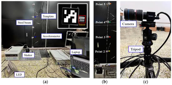 An experimental study was conducted to examine the performance of the proposed approach, in which a steel cantilever beam with dimensions of 2 mm × 20 mm × 1000 mm was used. The density of the beam was 7890 kg/m3, and the Young’s modulus was 2.1×1011 N/m2. In theory, the first two frequencies of the cantilever beam were five targets, and five accelerometers were attached on the beam at the same locations, so that the traditional modal analysis method based on accelerations can be used as a reference. The markers on the beam were numbered from bottom to top as points 1 to 5. Point 1 is just at the fixed end where it is a nodal point, therefore, there should be no response. Point 4 is near the nodal point of the second mode; hence, it is expected that the high frequency component in the dynamic response will be small, compared to the low frequency components. The accelerometer (DH1A108E) employed in this experiment has a mass of 5.2 g. The video was recorded at 50 frames per second by the camera, and the resolution was 2048 × 2048. The sampling frequency of the acceleration was 50 Hz. Figure 3a shows the overall experimental setup, Figure 3b shows the detailed view of the specimen and Figure 3c shows the enlarged side view of the camera and tripod.