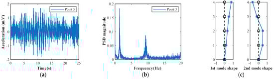 (a) Time history and (b) spectrum of acceleration at Point 3; (c) the mode shapes extracted from acceleration.