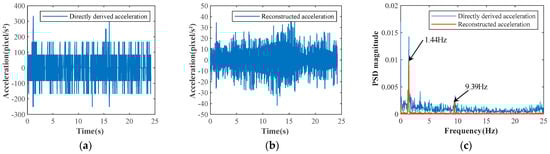 As the natural frequencies can be estimated by peak-picking from the spectrum, the proposed frequency domain operator can be used to reconstruct the displacement and acceleration. In fact, taking the displacement at Point 2 with the output voltage of excitation of 600 mV as an example, the acceleration obtained by applying central difference defined in Equation (16) on the original displacements, obtained by the template matching algorithm, is shown in Figure 5a. Then, after applying FFT on the directly calculated acceleration, the spectrum is shown as the blue line in Figure 5c. For comparison, the reconstructed acceleration is shown in Figure 5b, and the corresponding spectrum is shown as the yellow line in Figure 5c. As can be observed, the SNR of the reconstructed acceleration is higher than that of the directly calculated acceleration since the frequency components near the natural frequencies are maintained, while other frequency components are significantly reduced.