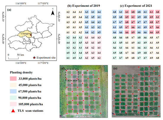 The study area is located in the Xiaotangshan National Precision Agriculture Research Demonstration Base (40°10′60″N, 116°26′30″E), Changping District, Beijing. The average annual precipitation in this area is 508 mm and the annual average temperature is 13 °C. In 2019 and 2021, we obtained LiDAR data of the maize filling period for different platforms and different sensors. The experiments were all designed with a completely randomized design. In 2019, the experiment consisted of five cultivars (A1–A5), four planting densities (D2–D5), and three random replicates. In 2021, the experiment consisted of five cultivars (A1, A6–A9), four planting densities (D1–D4), two planting row orientations, and two random replicates. The specific experimental design is shown in Table 1. In 2021, the study area was impacted by large hail, which lodged some of the plots. Therefore, only 68 plots with a small amount of lodging were used.