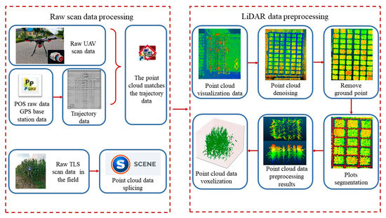 Raw data were stitched using the FARO SCENE software (version 2021.0) to generate TLS data. FARO SCENE can process and manage scanned data efficiently and easily by using automatic object recognition, scan stitching, and localization. The DLS data required calculation and data registration of different routes. The calculation was divided into two parts: trajectory calculation and raw laser data processing. First, using GPS base station data and position and orientation system (POS) data, accurate trajectory data are calculated by differential positioning algorithms [43] and the GPS level-arm inverse calculation of the POSPAC UAV software (version 7.1, Applanix Co., Richmond Hill, Canada) and then the RiProcess software (version 1.7.2, RIEGL Co., Southport, Queensland, Australia) to process the original laser data, performing waveform calculation, trajectory data matching, and 3D point cloud visualization. Finally, the data were exported as point cloud data in las format. The CloudCompare software (Open Source Project, version 2.10, www.cloudcompare.org, accessed on 26 June 2022.) was used to complete preprocessing for data from different platforms, including point cloud denoising, ground point filtering, and segmenting plots [35] (Figure 3).