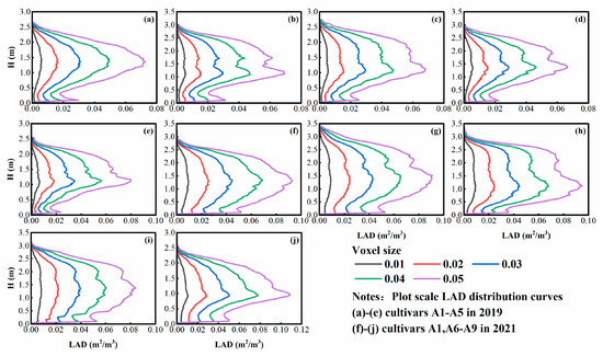 Plot-scale LAD distribution based on TLS under different voxel size at the filling period (a–e) cultivars A1–A5 in 2019 and (f–j) cultivars A1, A6–A9 in 2021.