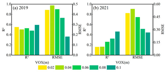 Plot-scale optimal voxel selection for TLS data (a) in 2019 and (b) in 2023.1.2. Optimal Voxel Selection for DLS Platform.