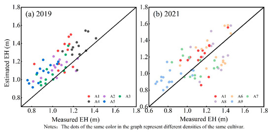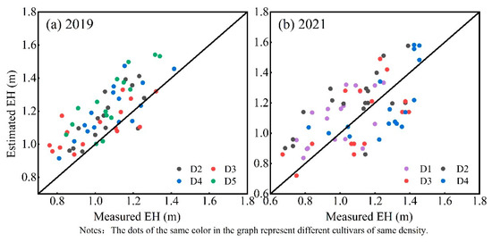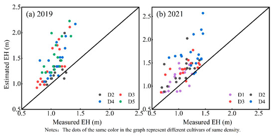 In 2019, when the planting density was of D4 or less, the R2 values of the estimated EH were both around 0.60, and the RMSE was around 15.00 cm (Table 5). At the planting density of D5, the R2 was higher, but RMSE also increased significantly to 21.60 cm. Figure 7a shows that for 85% of the plots, EH was overestimated in 2019. At planting densities of D2, D3, D4, and D5, EH was overestimated by more than 20 cm at 13.33%, 13.33%, 20.00%, and 53.33%, respectively. Thus, the overestimation of EH was more severe when the planting density was too high and the RMSE increased with increasing planting density.