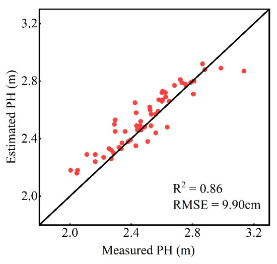 In 2021, the estimated EH had an R2 = 0.39 and RMSE = 18.40 cm and had better results for R2 and RMSE at all planting densities. However, R2 was lower and RMSE was higher than in 2019 at all planting densities. Likely this was due to a large amount of hail-damaged maize leaves in 2021. When planting densities were D1 and D2, the estimates were inferior than with densities D3 and D4. This may have been due to the low density of D1 and D2, which was caused by the hail that collapsed some maize plants within the same plot. However, at D3 and D4 planting densities, the results were still overestimated. Therefore, at higher planting densities, there is a more serious overestimation of EH at the plot scale. Accurate estimation of the PH is a key step in obtaining ER. The PH estimated from the 2019 TLS data had R2 = 0.86 and RMSE = 9.90 cm (Figure 8), providing the basis for estimating ER. Based on the results of EH and PH, we obtained the ER results for 2019. The ER did not show a decrease with increasing planting density; instead, the R2 was greatest at a density of D5 (Table 6). Overall, the R2 was 0.45 and the RMSE was 0.06. The ER estimates for different planting densities also all have an R2 around 0.40 and RMSE around 0.06. Therefore, the relationship between ER estimates and planting density was not significant, probably because ER is the result of the combined effect of PH and EH.
