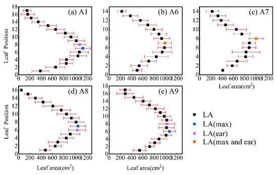 The proposed model relies on the maximum LAD of the three leaves at the ear position, but different cultivars do not necessarily have the maximum leaf area of the ear position leaves [47]. Li et al. [39] pointed out that maize generally has 22 leaves at the mature stage, and the ear position leaf of A2 is generally the 14th, which has the largest leaf area; the ear position leaf of A1 is generally the 16th leaf, which does not have the largest leaf area. Only data from 2021 were used because the 2019 measurements did not mark the ear position leaves. Figure 11 shows the average leaf area of each leaf measured for 32 maize plants of the same cultivar, where LA(max) is the leaf area of the largest leaf, LA(ear) is the leaf area of the ear position leaf, and LA(max and ear) is the leaf area of the ear position leaf and the largest leaf when they are the same leaf. The ear position leaves of A1 and A8 were located below the leaves with the largest leaf area. The ear position leaves of A6 and A7 had the largest leaf area. The ear position leaves of A9 were above the leaves with the largest leaf area. Therefore, the EH of different maize cultivars is not necessarily at the leaf with the largest area, but around the leaf with the largest leaf area.