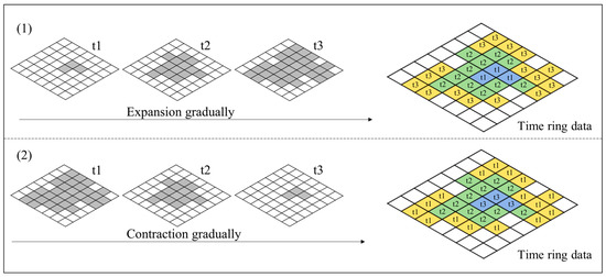 The general form of time ring (TR) data: (1) for spatially expansive feature; and (2) for spatially contractive feature.