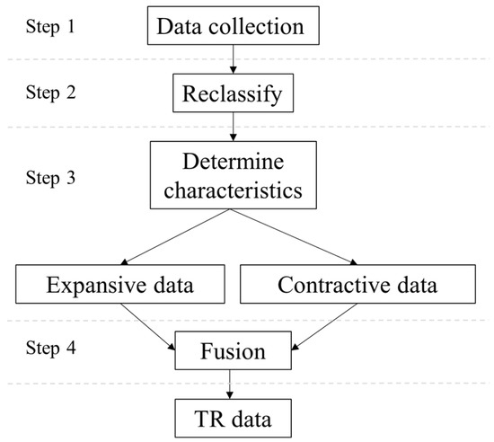 The generation of TR data involves four steps (Figure 2). The first step is to obtain a relevant remote sensing dataset with notable geographic features. Some datasets can be downloaded based on open-source satellite sensor data, such as normalized differential vegetation index (NDVI) data released by the Moderate-Resolution Imaging Spectroradiometer (MODIS) and nighttime light data produced by the Visible Infrared Imaging Radiometer Suite (VIIRS). Others are subject to further interpretation according to the original image, such as land cover data and urban built-up area data. The second step is to reclassify all images by assigning each pixel of the feature a time label and setting the other pixels to null. The third step is to determine whether the geographic feature is spatially expansive or contractive. We sum up the number of time labels on each image and establish whether the total increased or decreased over time. If the count is increasing, we consider it an expanding feature; otherwise, it is a contracting feature. The last step is to fuse all images in chronological order and produce the TR data. If a feature is expanding outward, the central region represents an older time and the peripheral regions’ time is newer. If a feature is contracting inward, then the central region represents a newer time and the peripheral region time is older.
