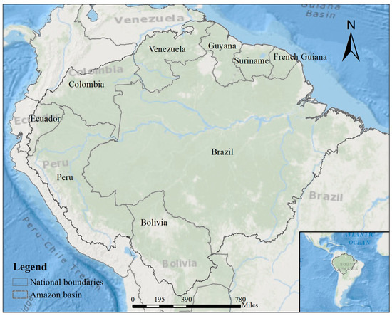 This study takes forest cover data in the Amazon basin as an example to check the utility of the TR data. The Amazon basin covers 7.05 million square kilometers, accounting for 40% of the total area of the South American continent. The region consists of parts of Brazil, Bolivia, Peru, Ecuador, Colombia, Venezuela, Guyana, Suriname, and French Guiana (Figure 6). The region has the largest tropical rainforest in the world, benefitting humankind by purifying the atmosphere and adjusting the climate. However, due to the impact of human activities, such as agricultural expansion, logging, and urban expansion, the land cover in the Amazon basin has undergone dramatic changes, especially with the massive loss of forest [31].