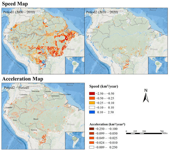 The speed and acceleration maps of forest loss in the Amazon basin. The negative value in the speed legend represents the speed of forest loss, and the negative value of acceleration represents the acceleration of forest loss.
