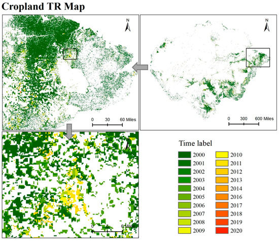 The cropland time ring (TR) map from 2000 to 2020 in the Amazon basin.