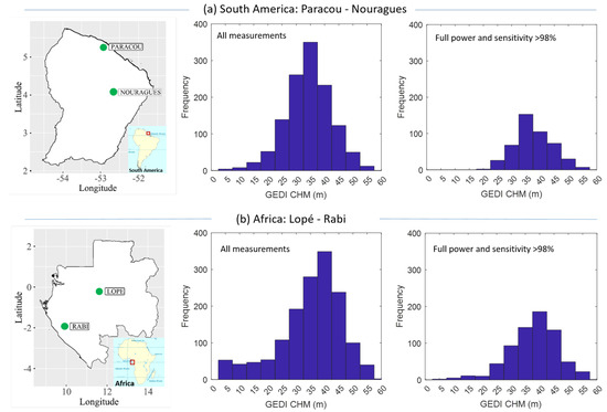 Forest sites used in this study with an adapted version of Figure 1 in []. (a) South America (SA): Paracou and Nouragues. (b) Africa (AF): Lopé and Rabi. The middle panels show the distribution of 1254 airborne LiDAR points in South America and 1505 in Africa. The right panels show the reduced dataset by selected full-power lasers and sensitivity greater than 98% (South America composed of 464 points and Africa 702) (see Section 2.2).